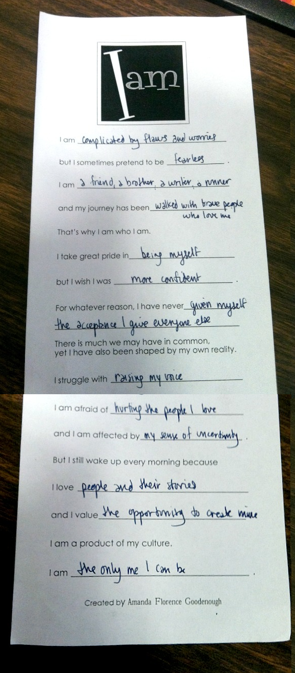 Today, amidst a busy and allergy-laden Wednesday, I opened an old padfolio to find this slip of paper. In an effort to be more vulnerable, I share my responses here: